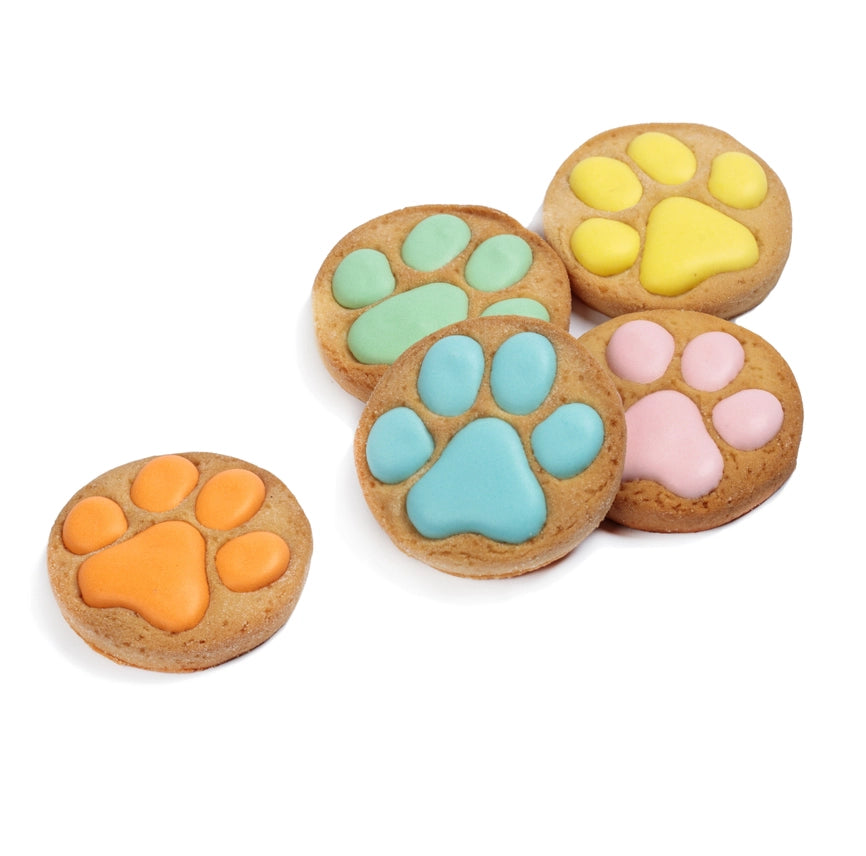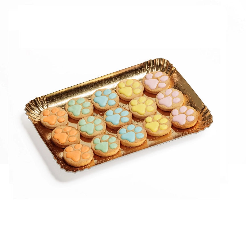 Søte avtrykk – Et sjarmerende brett med 15 hånddekorerte shortbread-kjeks formet som poteavtrykk i muntre farger: gul, rosa, blå, oransje og grønn. Hver kjeks er håndlaget og individuelt dekorert av våre mesterkonditorer i Italia.