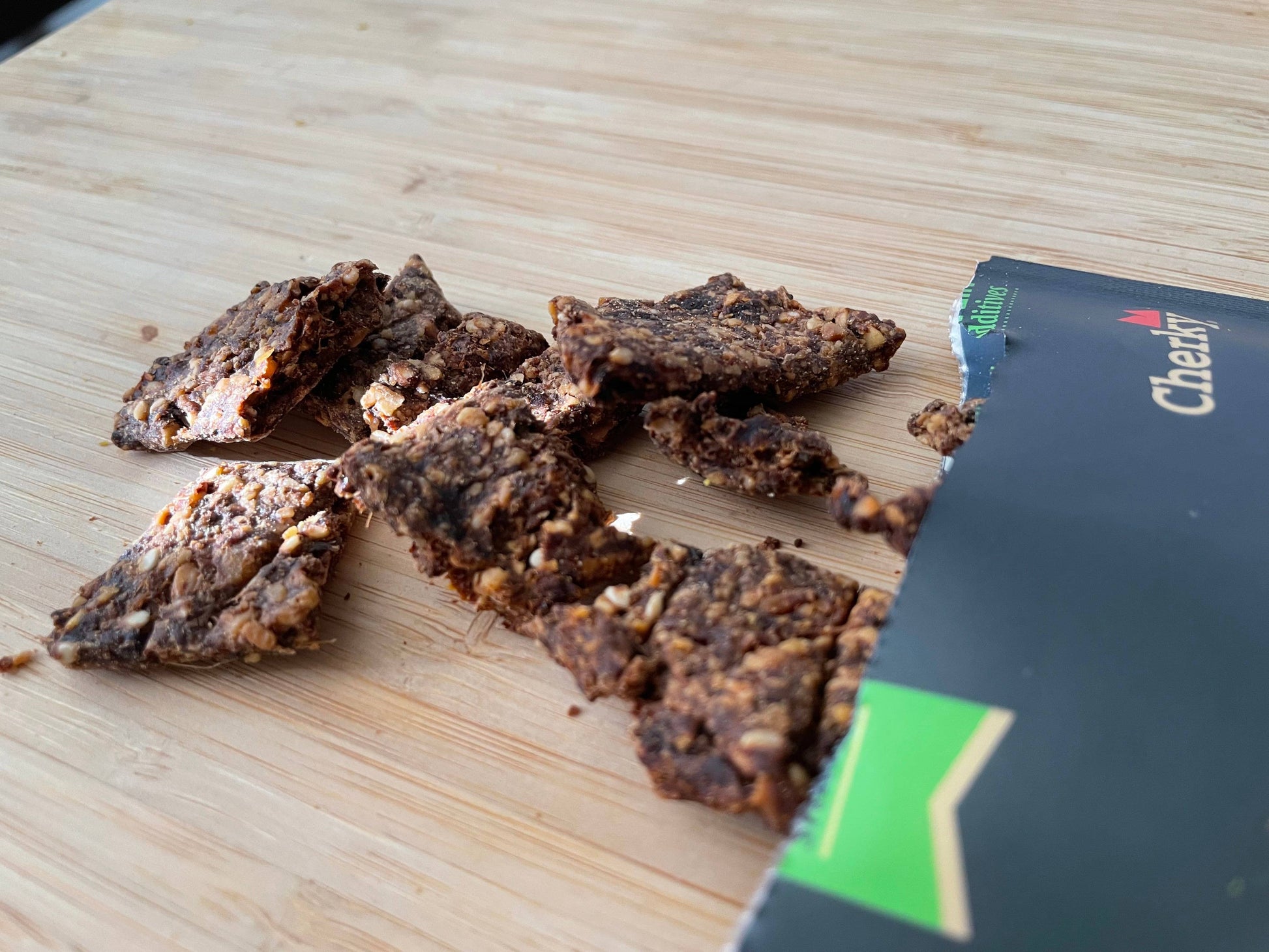 INGREDIENSER: Utvalda magra nötköttsbitar* 53,22% (169g nötkött används för att få 100g produkt), hasselnötter*, valnötter* 7,53%, cashewnötter*, soltorkade tomater* 5,02%, sesamfrön*, chiafrön* 2,51%, dadlar*, russin*, havssalt*.